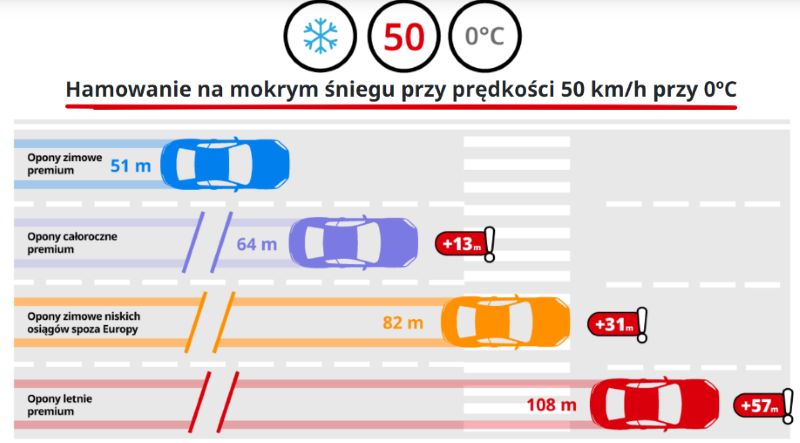 Jeśli jedziesz po śniegu na letnich oponach swoim autem (osobówką, SUVem czy vanem), także EV, także 4x4 – to ponad 50 metrów zabraknie, żeby zahamować przed uderzeniem. To znaczy, że nie ma prędkości bezpiecznej na letnich oponach na śniegu czy błocie pośniegowym. Po prostu ani kierowca, ani systemy samochodu nic z tym faktem nie zrobią przy braku przyczepności i szczątkowej sile tarcia.